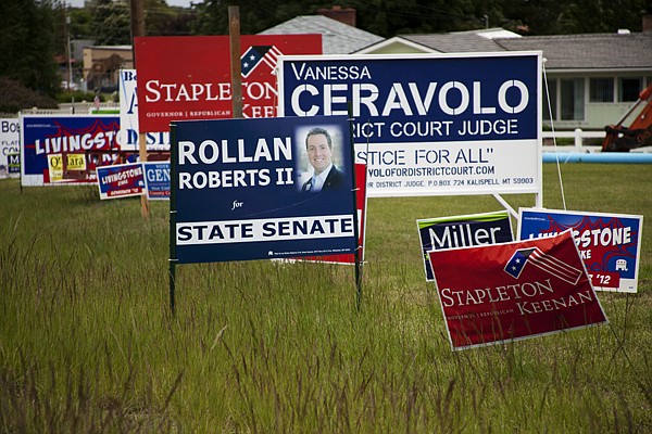 Campaign signs line the side of U.S. 93 in Kalispell on Wednesday, June 6.