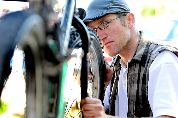 Brandon Nelson of Kalispell helps fix bikes at the Homeless Connect event on Thursday morning, June 6, at Samaritan House in Kalispell. Nelson is a member of the Kalispell Wheelmen, a mutant bike club, helping out at the event is a service project for the organization.