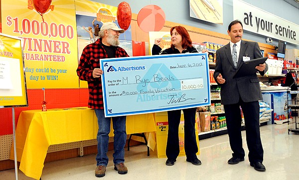 From left, Roy Beals of Olney stands with Amy Holtz and Jeff Brown of Alberson's as they present him with the check for $10,000 on Wednesday, June 6, in Kalispell. Beals won the prize as part of the Sizzlin' Summer Give Away contest.