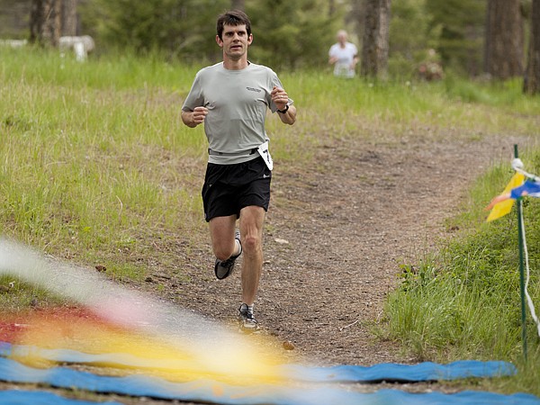 Pete Heyboer crosses the finish line after running the marathon section of the first Herron Marathon half marathon and 10K in Kalispell on Saturday. Heyboer’s wife, Jenny, ran in the event as well.