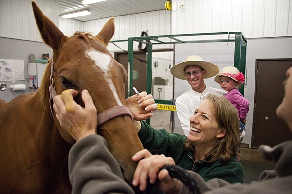 Dr. Valerie Linse examines Tom Scalese’s horse, Red, as he and his daughter, Sicily, watch at the LaSalle Equine Clinic in Kalispell on Monday, June 11.
