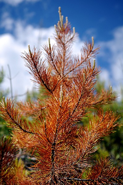 Detail shot of trees infected with the needle cast fungus Lophodermella along the North Fork Road on Tuesday, June 12, just outside Glacier National Park.