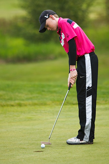 Patrick Cote/Daily Inter Lake Riggs Johnston sinks a par put on Hole 2 at Meadow Lake Golf Course Tuesday afternoon during the Flathead Valley Junior Tour. Tuesday, June 12, 2012 in Columbia Falls, Montana.