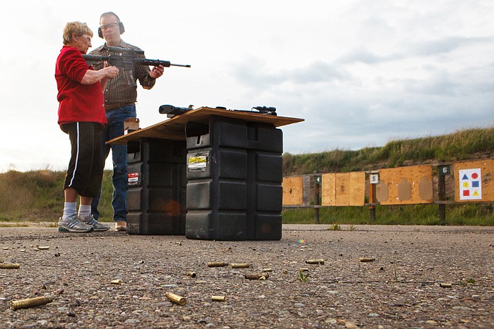 Patrick Cote/Daily Inter Lake Sgt. Brad Stahlberg shows Marguerite Kaminski how to shoot his .22-conversion M4 rifle during range day at SheriffÕs CitizensÕ Academy. Thursday, May 17, 2012 in Kalispell, Montana.