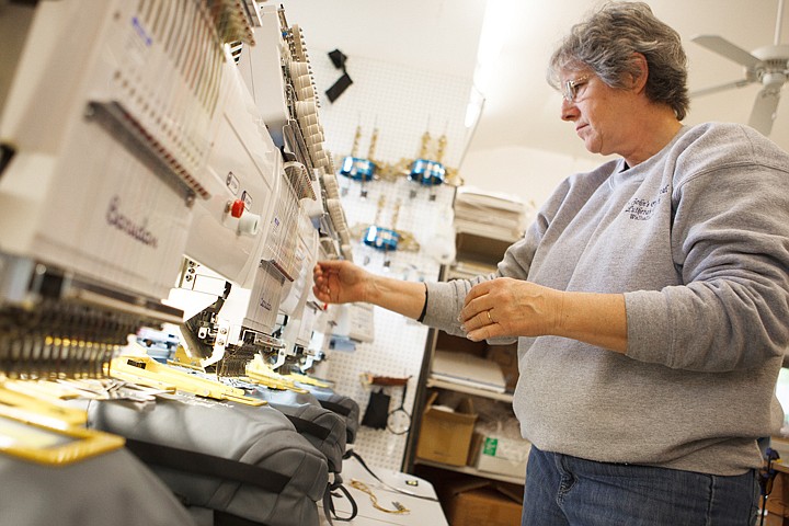 Patrick Cote/Daily Inter Lake Susan Shea, production manager at Corporate Image Outfitters, makes adjustments on an embroidery machine Wednesday afternoon in Whitefish. Corporate Image Outfitters specialize in embroidering logos onto clothing, hats and gear. Wednesday, June 13, 2012 in Whitefish, Montana.