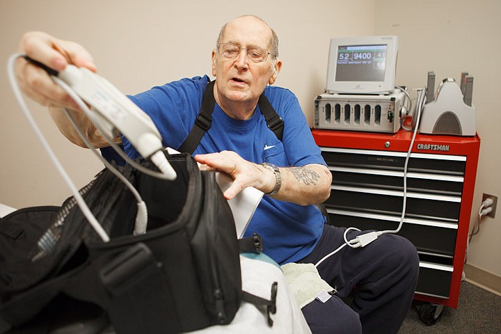 While a system monitor checks the status of his pump, Russ Harold repacks the emergency kit for his left ventricular assist device recently during a checkup at The Rock medical office building. The emergency kit contains spare batteries and a backup computer that controls the pump connected to his heart.