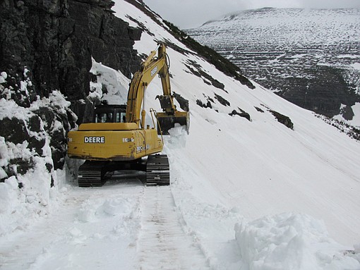 Plowing crews are currently digging out the Big Drift, which accumulates 100 to 150 feet of snow each winter just east of Logan Pass.