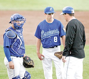 Logger coach Kelly Morford talked to pitcher Creede Garcia in the first game, as Micah Germany looked on.