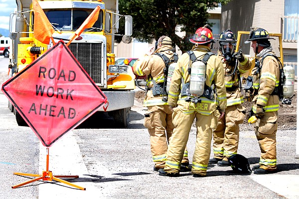 From left, Todd Hawes Captain Craig Fischer, Joe Hansen and Ian Miller of the Kalispell Fire Department B shift converge to discuss the situation at Spruce Wood Apartments on Thursday afternoon, June 14, in Kalispell. A gas leak was reported which required the Fire Department to help evacuate residents and be on site in case of a fire.