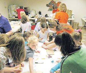 Volunteers help fourth grade girls cut out moose heads to glue on paper bags. The “moose-bags” were fitting with the week’s theme of National Parks at Vacation Bible School, held at Libby Christian Church.