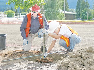 Vicky Lawrence, City Councilwoman, right, and Dave Jones, a representative of the Department of Natural Resources and Conservation from Kalispell, tell the folks at Riverfront Park for the tree planting to fill the holes to the right levels.