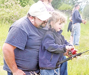 D.J. Welch shows his 3-year-old daughter Allyson the finer parts of trout fishing in her first time out. D.J. and Allyson were just one of dozens of families at Roosevelt pond Saturday morning in Troy fishing for Father’s Day weekend.