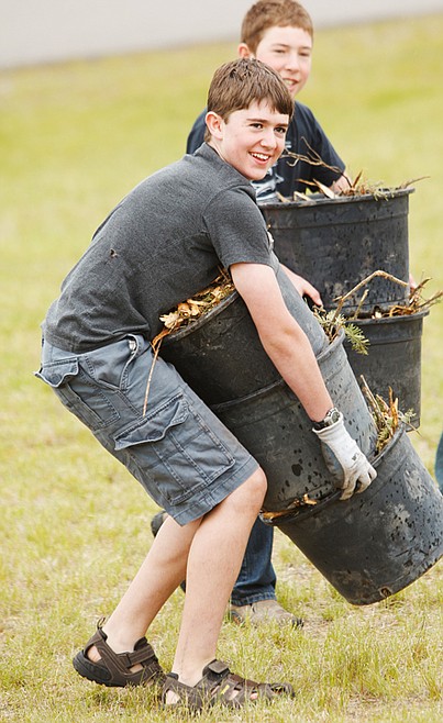 Alden Drew, left, and Erick Boothman carry buckets of wood chips Monday morning during the groundbreaking of Grace Orchard at Kalispell Middle School. Monday, June 18, 2012 in Kalispell, Montana.