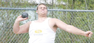Sawyer Zimmerman with a 43'1" toss in the shotput at the County Meet May 1.