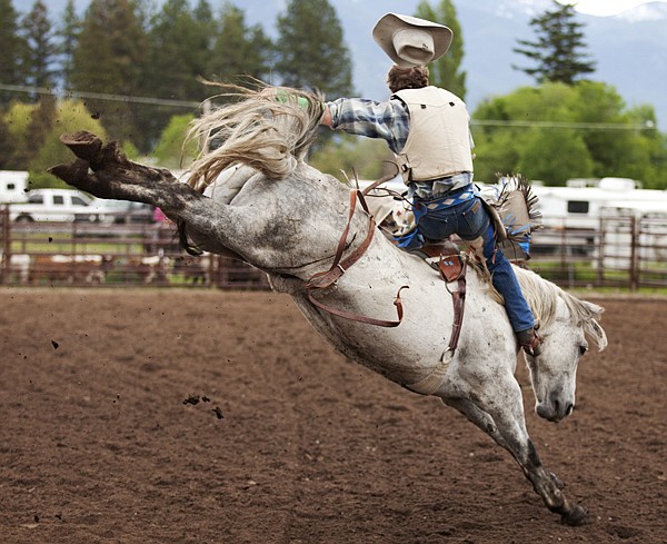 Kyle Delaney, of Polson, holds on during the bareback competition in the Blue Moon Summer Series rodeo in Columbia Falls on Thursday, June 14. Delaney, riding with a broken left wrist, was riding right-handed for only his second time.