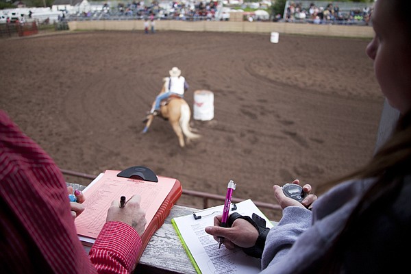 In the announcers booth at the Blue Moon Summer Series rodeo, timers Shandi Higgins, right, and Kelly Hawkinson, are recording times of riders in the open barrels event on Thursday, June 14.