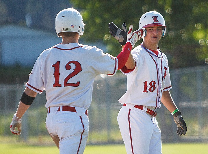 Patrick Cote/Daily Inter Lake Adam Frandsen (12) and Sean O'Connell (18) celebrate after both scored in the first inning of the Lakers' win over the Twins Wednesday night at Griffin Field. Wednesday, June 20, 2012 in Kalispell, Montana.