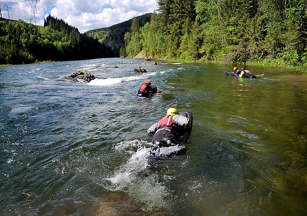 Participants in the Montana Search And Rescue Rendezvous Swiftwater Rescue and Recertification course make their way down the South Fork on Friday afternoon, June 15, near the Hungry Horse Dam. Over the weekend first responders, emergency personnel and members of the public were able to take a variety of classes in subjects like: map and compass reading, lost person behavior, aviation resources, first aid, and many others.