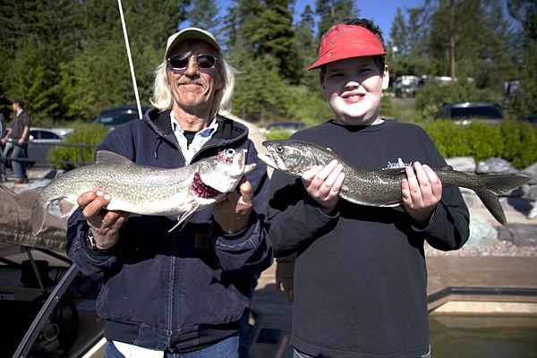 Captain Tim Shattuck and 11-year-old Tristan Houk hold up lake trout they caught Thursday during the 19th Annual Fishing Without Barriers Day on Flathead Lake.