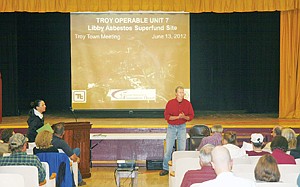 John Podolinsky, in red, begins his speech last Wednesday in the Troy High School auditorium. Podolinsky, a Superfund project manager with the Department of Environmental Quality, spoke about changes in Troy and took questions.