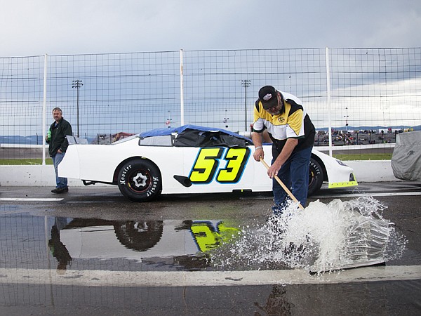 Tech official Bruce McMaster uses a squeegee to remove water from the pit area following a storm at Montana Raceway Park on Saturday, June 23. Officials rescheduled the race for 1 P.M. on Sunday, June 24.
