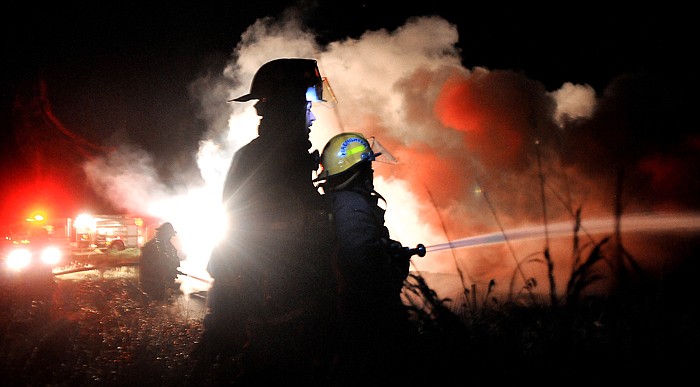 West Valley firefighters Shawn Loughery, left, and Tina Venturini help put out the last of a fire on West Springcreek Road just before 3 a.m. on Saturday, June 23, in West Valley. The call came in at 2:13 a.m. Firefighters from West Valley were joined by the teams from Smith Valley and South Kalispell.