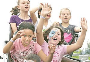 Olivia Smith, left and Melissa Munroe (both 9) of Libby, aboard the roller coaster Saturday at the Paradise Carnival.