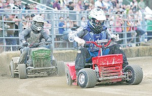 Chris Spangler of Bonners Ferry placed second on a Kohler 20hp lawnmower behind Buck Taggert of Viola on an Ace Hardware 18.5hp in the open class Saturday night during the Logger Days lawnmower races.
