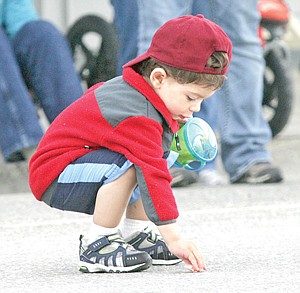 Armed with a "sippy" cup, two-year-old Nik Arunachalan gathers candy during the Logger Days Parade.