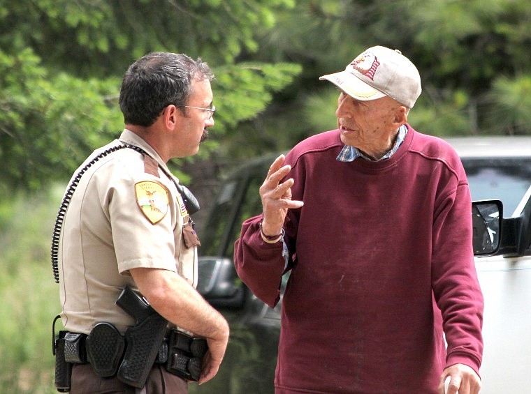 Sanders County Sheriff Tom Rummel speaks with Renn Bodeker at his property outside Paradise June 18. Rummel stated he was present to "make sure the peace is kept," and Bodeker vacated his property that day.