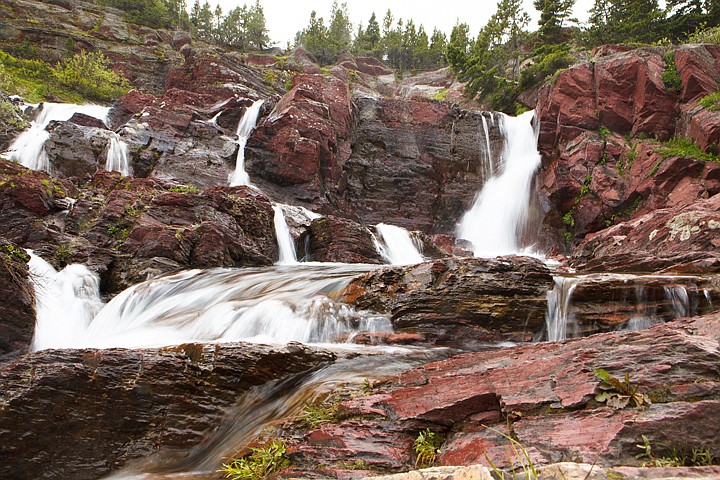 Almost two miles up the Swiftcurrent Trail in Many Glacier, Swiftcurrent Creek cascades down aptly named Redrock Falls on the east side of Glacier National Park.