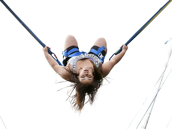 Fifteen-year-old Morgan Payne from Kalispell flips upside down as she jumps on a trampoline provided by the Zone Family Fun Center. The swap meet and farmers market offers a bounce house, pony rides, face painting and more for the kids.