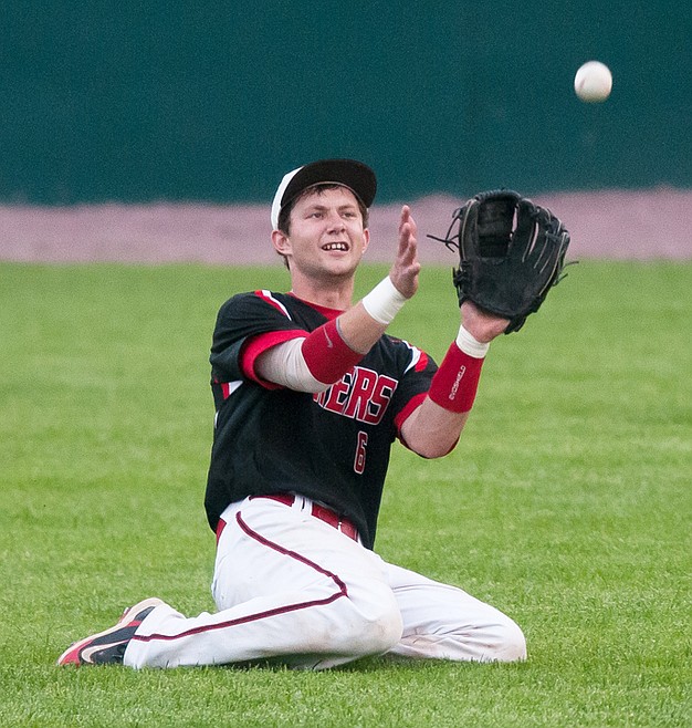 Kalispell Lakers outfielder Cody Dopps makes a sliding catch to end the bottom of the fourth inning against the Glacier Twins Saturday evening during Sapa-Johnsrud Tournament play at Memorial Park.