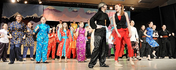 Abby Van Allen as Mulan and Christine West as Mushu, left to right in front, in the dress rehearsal of Disney's Mulan on Wednesday afternoon at Kalispell Middle School. The play opens tonight at 7 p.m. in the cafetorium.