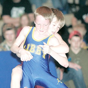 Colten Clemons escapes from Terran Winebark of Troy at Novice C, during the Kootenai Klassic Little Guy Invitational Wrestling Tournament Saturday. There were 551 bracketed wrestlers competing in Saturday's tourney.