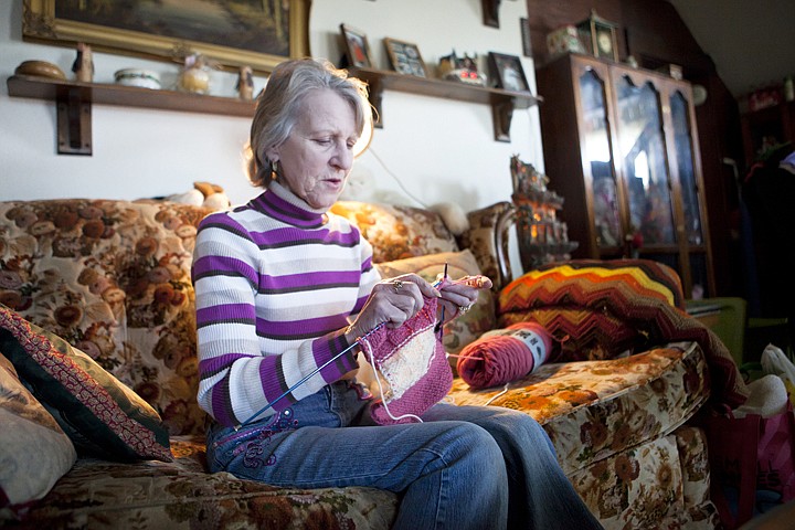 Peggy Glass knits a scarf Friday morning in her home outside Whitefish.