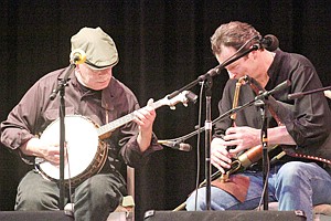 Flotating Crowbar's Don Thomsen on banjo and James Hunter on uilleann pipes, complete with safety belt and air bag.