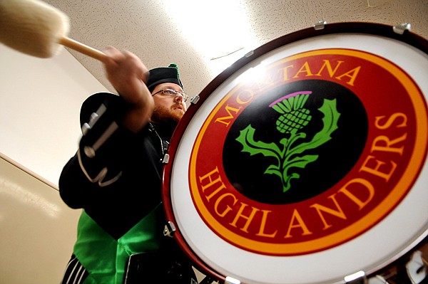 Rob Eberhardy, base drummer for the Montana Highlanders, takes part in a full dress rehearsal on Monday night at Bethlehem Lutheran Church in Kalispell. The traditional pipe band will be participating in the annual Saint Patrick's Day Parade on Saturday at 4 p.m. Later that day they will perform at Nickel Charlie's at 5:25, at Del's Bar in Somers at 6, and at Tall Pine in Bigfork at 730.