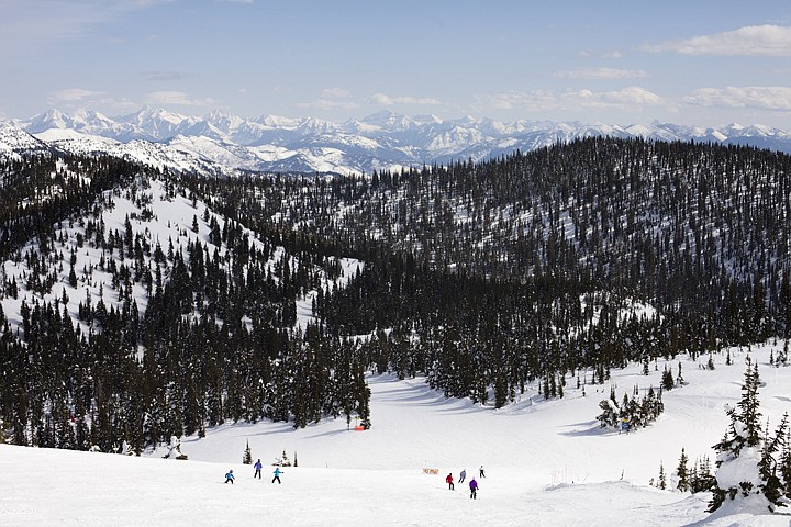 With a view of Glacier National Park in the distance, skiers and snowboarders make their way down Moe Mentum Run at Whitefish Mountain Resort on Saturday afternoon. The resort has 106 inches of snow at the summit of Big Mountain with more snow predicted this week.