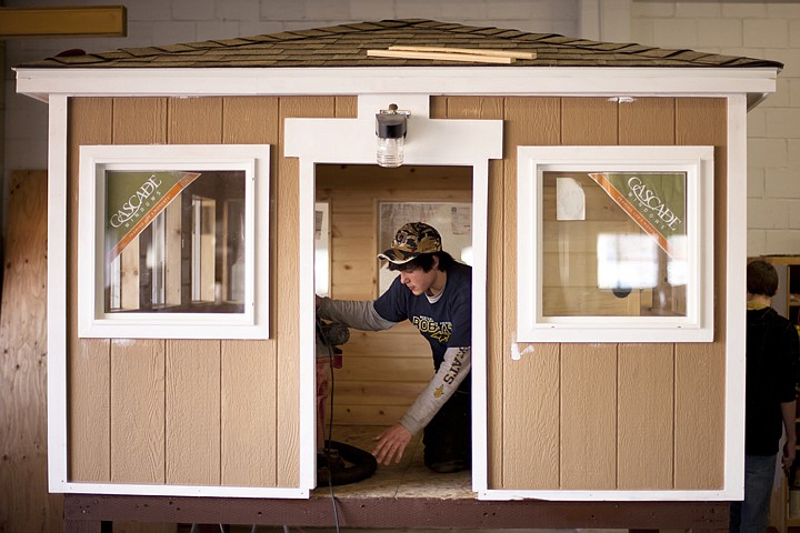 Flathead seniors Seth Hall and Rutger Evans were working on the playhouse Tuesday to complete it before the weekend where it will be displayed at the Flathead Building Association Home and Garden Showcase.