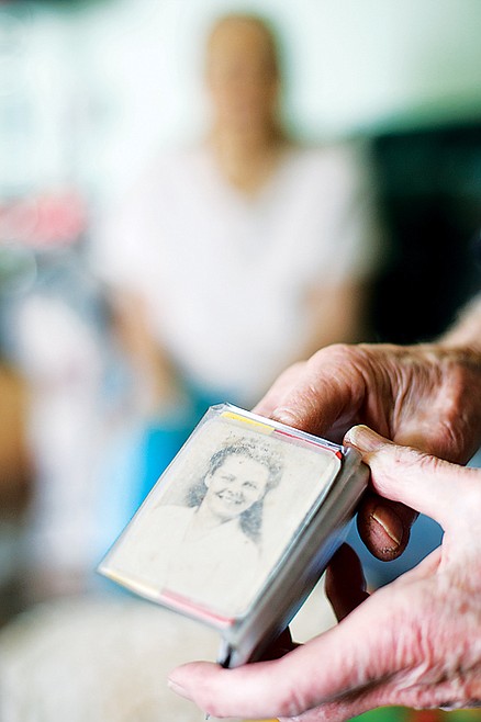 He stands, pulls out his wallet and walks across the room. He pulls out a wrinkled, worn black and white photo.