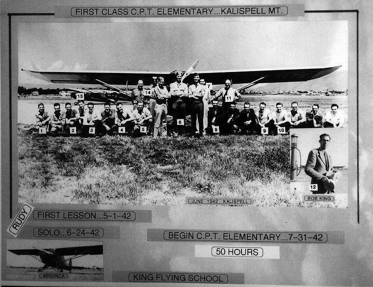 Kalispell’s first Civilian Pilot Training class poses for a photo in June 1942. Pictured are: 1. Rudy Bergstrom; 2. Jack McWilliams; 3. Don Riley; 4. Roger Haines; 5. D.C. Dunham; 6. three Air Force advisers; 7. Larry Stockhill; 8. Mope Dickinson; 9. Don Clapper; 10. Russell Diest; 11. Titus Kurtichanof; 12. Bob King; 13. Ace Powell; 14. ground school instructors.