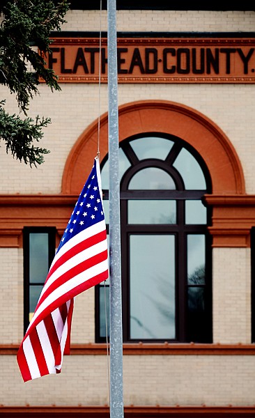 The flag on the front lawn of the historic Courthouse flies at half-staff on Monday as a sign of mourning following the announcement that former Flathead County sheriff and current county commissioner Jim Dupont had died of an apparent heart attack. Dupont was 65.