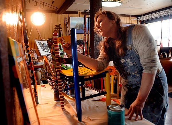 Dawn Duane Evans paints a child-sized chair on Thursday, March 14, in her studio in downtown Kalispell. Evans contributed two chairs for the upcoming Loud at the Library fundraiser which will be held from 5:30-8:30 p.m. on Thursday, March 22, at the Flathead County Library in Kalispell. Tickets are $30, 20 of which is tax deductible. Six adult chairs, 2 children's chairs, and a 24 drawer card catalog will be auctioned at the event.