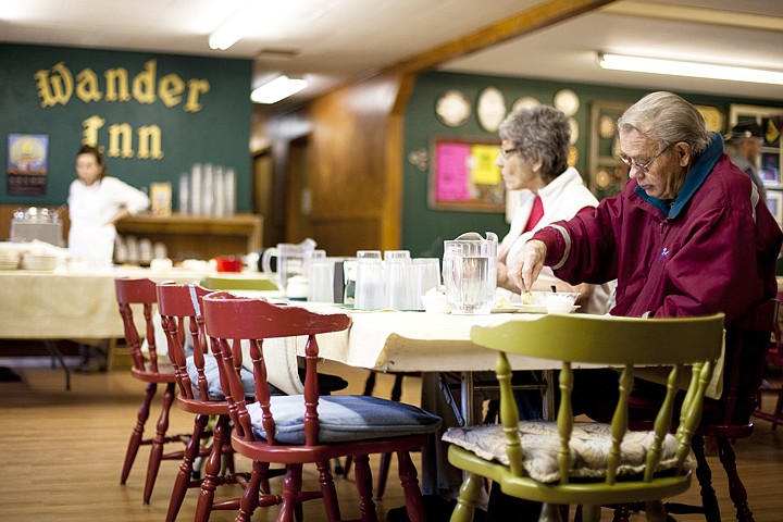 Gerrie and Jim Boyle eat corned beef and sauerkraut soup Tuesday afternoon at Soup's On in Polson. The Soup's On project, located in the Wander Inn, provides free lunch four days a week. Tuesday, March, 20, 2012 in Polson, Mont.