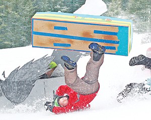 Cy Stevenson finishes the cardboard sled race the hard way Saturday during Crazy Day at Turner Mountain.