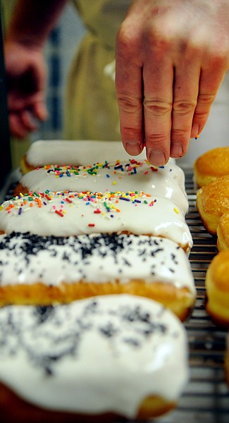 Jeremy Potter decorates a row of doughnut bars on Wednesday, March 21, at Powza! Bakery in Whitefish. The bakery also makes circles, bismarcks, fritters, and raised doughnuts as well as cake doughnuts, cup cakes, cookies, meat pies, and frittatas.