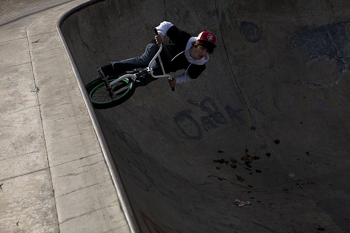 Patrick Cote/Daily Inter Lake Picking up speed to perform a trick, Sean McComb rides through the curve of the bowl at the Woodland Park Skatepark Thursday afternoon.