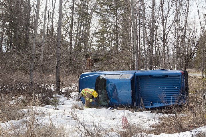 A Bigfork firefighter looks inside the cab of a truck that rolled over off of Highway 83 Monday morning. The driver of the vehicle was transported to the hospital with minor injuries. Monday, March, 26, 2012 in Kalispell, Mont.