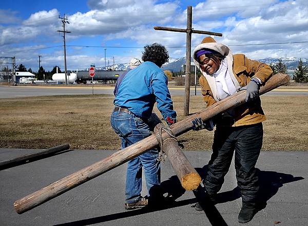Margaret Baylinson, right, works along side Ron Corcoran, center, and Dick Daniels, in background, all members of the church and from Columbia Falls, to raise crosses in front of Saint Richard's Catholic Church on Tuesday afternoon, March 27, in Columbia Falls. The three crosses have been raised along Highway 2 for the past five years. They go up the week before Palm Sunday and are taken down after Pentecost, fifty days after Easter Sunday.